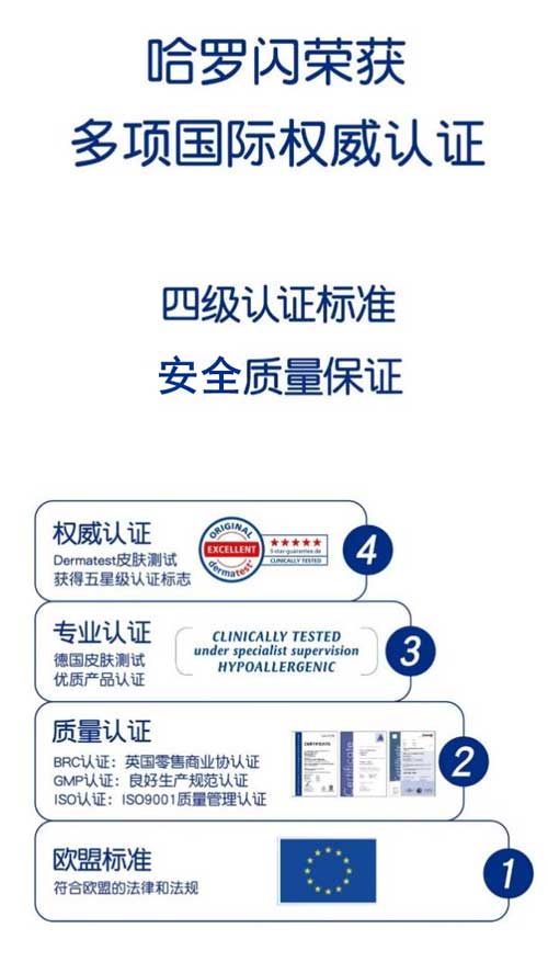 哈羅閃的產(chǎn)品研發(fā)、生產(chǎn)均符合歐盟標(biāo)準(zhǔn),并擁有德國皮膚測試的優(yōu)質(zhì)產(chǎn)品認(rèn)證;如,哈羅閃嬰兒凈護(hù)二合一洗發(fā)沐浴露、哈羅閃嬰兒柔護(hù)潤膚乳、哈羅閃嬰兒柔護(hù)按摩油、哈羅閃嬰兒溫和護(hù)膚霜等,均通過了德國權(quán)威皮膚科醫(yī)生協(xié)會(huì)認(rèn)證Dermatest的皮膚測試,并獲得5星級認(rèn)證,達(dá)到5星標(biāo)準(zhǔn)即代表產(chǎn)品通過極為嚴(yán)苛的檢測程序。