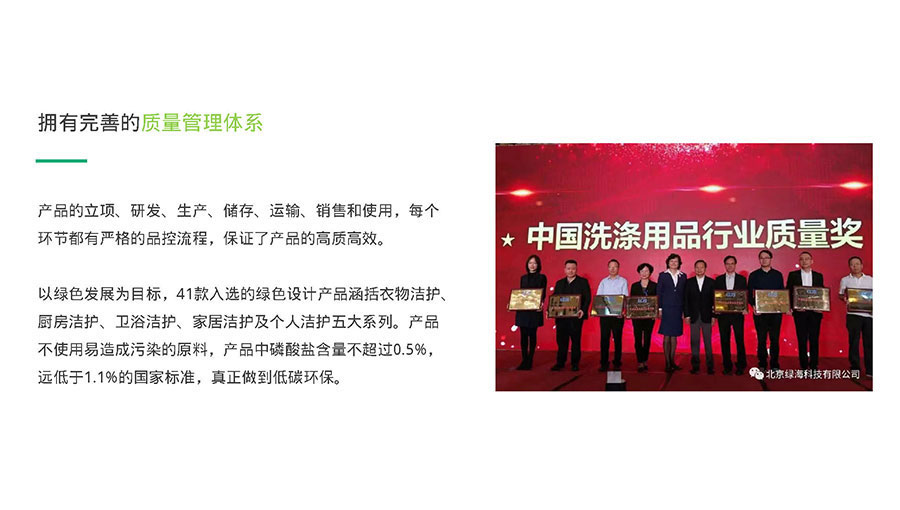 2018年11月,以綠色發(fā)展為目標(biāo)的41款綠傘產(chǎn)品入選綠色設(shè)計(jì)產(chǎn)品。這些產(chǎn)品均不使用易造成污染的原料,磷酸鹽含量不超過(guò)0.5%,遠(yuǎn)低于1.1%的國(guó)家標(biāo)準(zhǔn),真正做到低碳環(huán)保。同年,綠傘榮獲中國(guó)洗滌用品工業(yè)協(xié)會(huì)頒發(fā)的“中國(guó)洗滌用品行業(yè)質(zhì)量獎(jiǎng)”,這一獎(jiǎng)項(xiàng)的頒發(fā)充分肯定了綠傘一直以來(lái)嚴(yán)把質(zhì)量關(guān)、綠色環(huán)保的發(fā)展戰(zhàn)略。