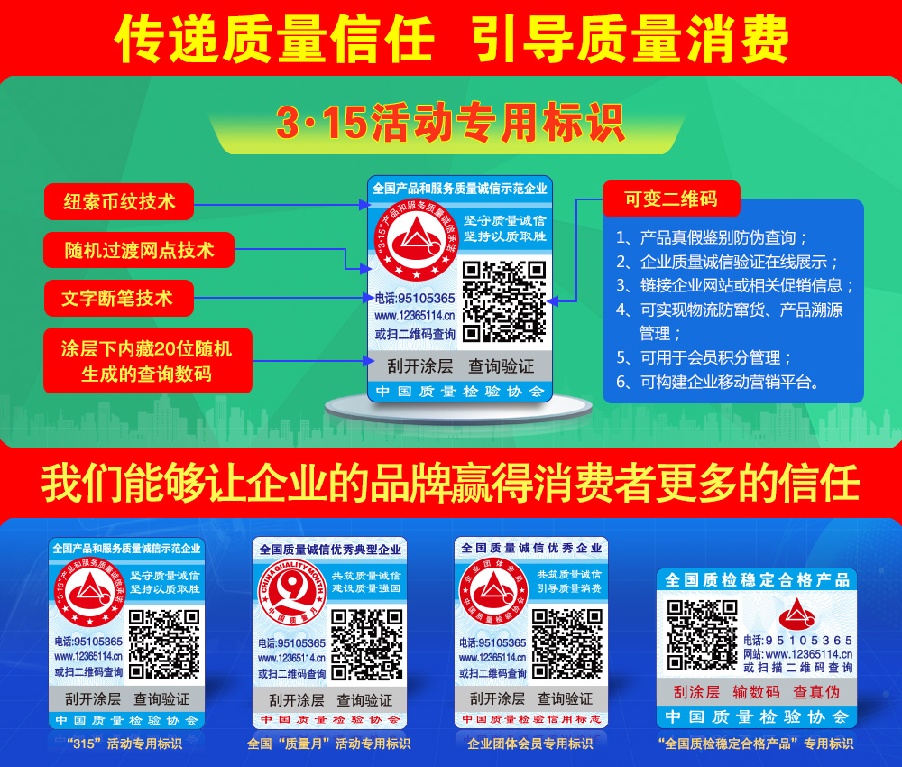 中國(guó)質(zhì)量檢驗(yàn)協(xié)會(huì)防偽溯源和物流管理服務(wù)系統(tǒng)(簡(jiǎn)稱中檢聯(lián)合質(zhì)量誠信驗(yàn)證系統(tǒng))是以物聯(lián)網(wǎng)、大數(shù)據(jù)、云計(jì)算、區(qū)塊鏈和移動(dòng)互聯(lián)網(wǎng)技術(shù)為基礎(chǔ)建設(shè)的全過程防偽溯源與質(zhì)量誠信驗(yàn)證服務(wù)平臺(tái),依托廣大技術(shù)機(jī)構(gòu)的技術(shù)支撐,應(yīng)用二維碼為載體,使用一物一碼防偽技術(shù),同時(shí)采用文字、圖片和視頻等多媒體方式,完整記錄產(chǎn)品的原料來源、生產(chǎn)加工、倉儲(chǔ)物流和市場(chǎng)銷售等詳細(xì)信息,融合實(shí)現(xiàn)產(chǎn)品質(zhì)量來源可查、去向可追、責(zé)任可究的全過程追溯,切實(shí)方便企業(yè)履行質(zhì)量安全主體責(zé)任并用科技、智能化、信息化的手段去加強(qiáng)質(zhì)量安全風(fēng)險(xiǎn)控制,維護(hù)消費(fèi)者合法權(quán)益,讓人民群眾買得放心、吃得放心、用得放心...