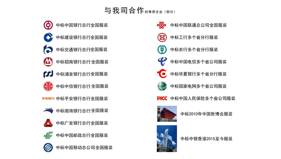 團(tuán)購(gòu)服務(wù)網(wǎng)絡(luò)已覆蓋全國(guó)各省、市、縣(區(qū))及鄉(xiāng)鎮(zhèn)各級(jí)地域,分公司遍及全國(guó),有5000余家門店,10000余名服務(wù)人員,300余名量體師為制裝客戶提供全面的售后服務(wù)。持續(xù)為國(guó)內(nèi)四大國(guó)有商業(yè)銀行及交通銀行、浦發(fā)銀行、招商銀行、中信銀行、廣發(fā)銀行等一系列大型企業(yè)設(shè)計(jì)行業(yè)制服??蛻羧荷婕敖鹑凇⒈kU(xiǎn)、電力、法院、檢察院、稅務(wù)、工商、水政、技術(shù)監(jiān)督、電信、移動(dòng)、聯(lián)通、郵政、公路、航空機(jī)場(chǎng)、地鐵、保險(xiǎn)、券商、上市公司、環(huán)保、煙草、學(xué)校、醫(yī)院等20萬余家政府、企事業(yè)單位。更為國(guó)慶、世博會(huì)、奧運(yùn)會(huì)、達(dá)沃斯論壇一系列大型盛會(huì)制作正裝。