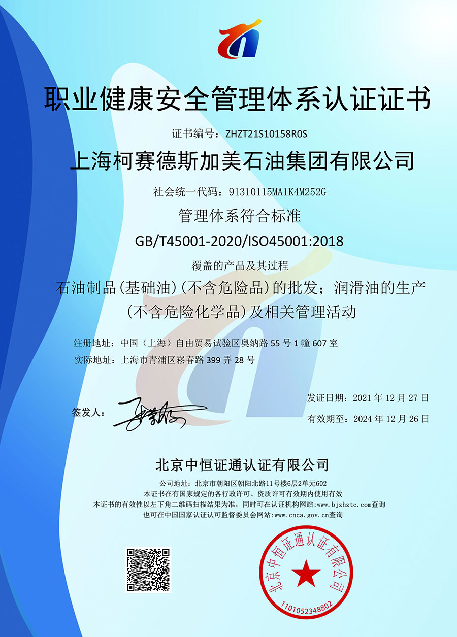 柯賽德斯集團公司統(tǒng)一遵循嚴格的質(zhì)量保證體系,先后通過了武器裝備質(zhì)量管理體系認證GJB9001C-2017、ISO/TS16949、IS09001質(zhì)量體系認證、1S014001環(huán)境體系認證及ISO45001:2018職業(yè)健康安全管理體系認證。隨著業(yè)務領(lǐng)域的不斷擴展,目前柯賽德斯集團公司先后與多家世界能源、化工方面的巨頭建立了產(chǎn)品服務、供應保障、技術(shù)合作、技術(shù)特別支持單位等方面的戰(zhàn)略合作關(guān)系。今天,柯賽德斯集團公司旗下管理著三大潤滑油品牌,實現(xiàn)了經(jīng)營上的多元化戰(zhàn)略格局。