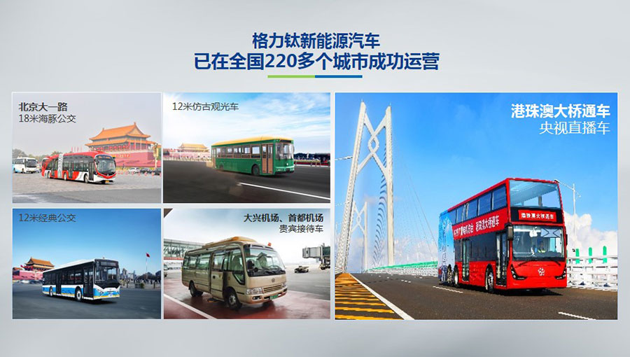 目前,格力鈦生產(chǎn)的新能源汽車于北京、杭州、武漢、青島、哈爾濱、包頭、海口等全國(guó)220多個(gè)城市運(yùn)營(yíng)。2014年,仿古鐺鐺車榮膺第22屆北京APEC會(huì)議官方指定用車、登陸北京環(huán)天安門(mén)旅游觀光線;2016年,雙層巴士榮膺第二屆中美低碳峰會(huì)指定用車、登陸國(guó)內(nèi)首條純電動(dòng)雙層觀光車線路——北京城市旅游觀光3線;2017年,18米海豚公交車投入北京長(zhǎng)安街1路運(yùn)營(yíng);2018年,港珠澳大橋正式通車,雙層巴士擔(dān)綱中央廣播電視總臺(tái)直播車,成為首輛駛上港珠澳大橋的大巴車。