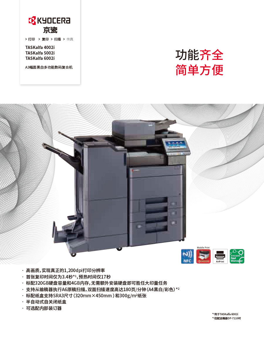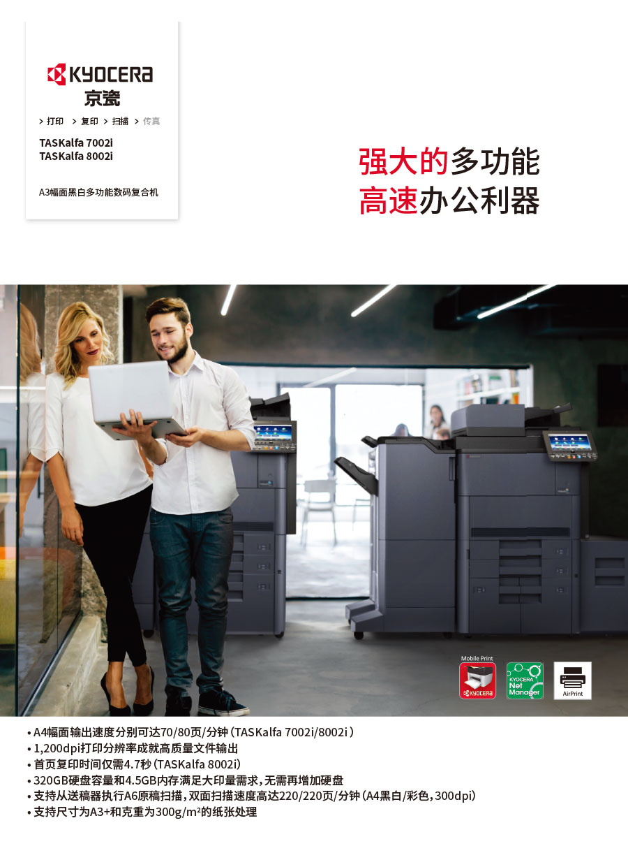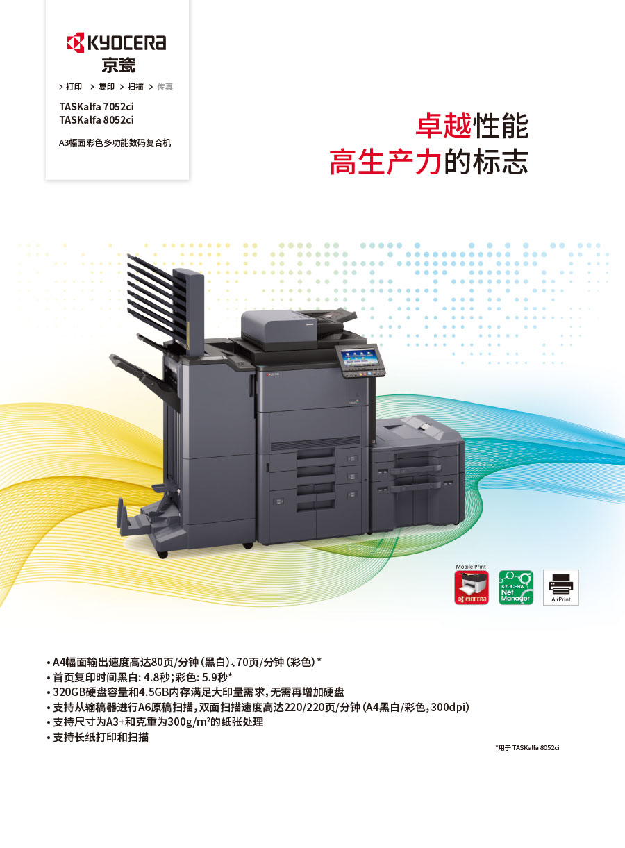 主要產(chǎn)品:KYOCERA京瓷激光打印機,一體機,復(fù)合機,生產(chǎn)型彩色噴墨數(shù)碼印刷系統(tǒng)及辦公信息系統(tǒng)的開發(fā)、設(shè)計、系統(tǒng)集成