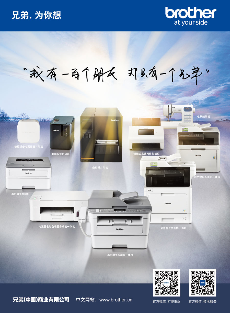 Brother作為擁有110多年歷史的國際化品牌,目前已在全球40個以上的國家和地區(qū)擁有研究開發(fā)基地、生產基地以及銷售公司。作為Brother集團在中國的產品銷售與服務的外商獨資企業(yè),兄弟(中國)充分利用集團的資源優(yōu)勢,秉承“At your side.”的企業(yè)文化理念,遵循顧客第一的宗旨,傾聽顧客的呼聲,為中國消費者提供更多具有高附加值的產品和服務。兄弟(中國)的事業(yè)領域包括以打印機、多功能一體機、傳真機、標簽打印機、掃描儀等產品為代表的打印及解決方案事業(yè);以家用縫紉機、商用繡花機、電腦花樣裁切機為中心的家用機器事業(yè)。