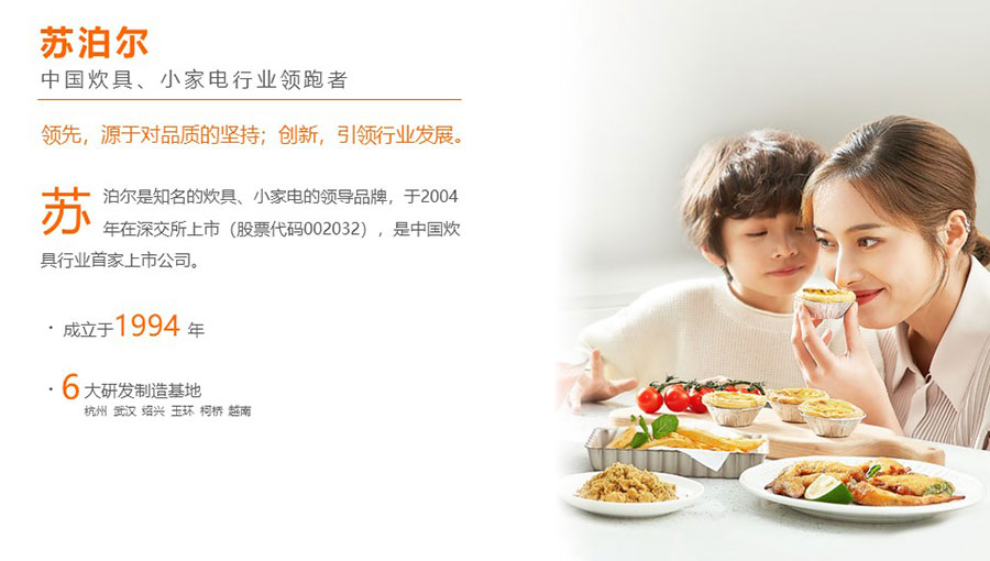 浙江蘇泊爾股份有限公司是中國最大、全球第二的炊具研發(fā)制造商,中國廚房小家電領先品牌。在杭州、玉環(huán)、紹興、武漢和越南建立了5大研發(fā)制造基地,擁有1萬多名員工。蘇泊爾是中國炊具行業(yè)首家上市公司(股票代碼002032)。浙江蘇泊爾家電制造有限公司是浙江蘇泊爾股份有限公司的控股子公司,注冊資本13369萬元,自2004年1月成立,主要生產(chǎn)電飯煲、電蒸鍋、電燉鍋、煎烤器等廚房小家電產(chǎn)品。2022年營收達到37.65億元,擁有2100多名員工,目前為中國最大的電飯煲生產(chǎn)基地。