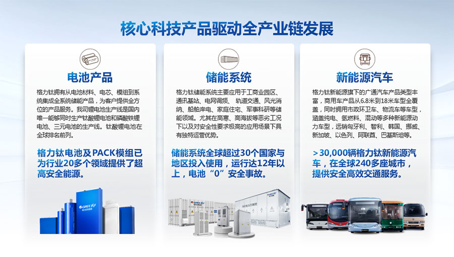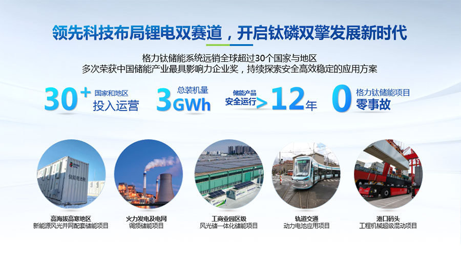 以完善的研發(fā)體系,公司加快技術(shù)創(chuàng)新與產(chǎn)業(yè)升級(jí)的步伐。公司研發(fā)的格力鈦電池安全性長(zhǎng)期領(lǐng)跑行業(yè),憑借具有高安全、大倍率、快充放、耐寬溫、長(zhǎng)壽命等特性,被選為“國(guó)家制造業(yè)單項(xiàng)冠軍產(chǎn)品”,廣泛應(yīng)用于新能源汽車以及工商業(yè)園區(qū)、通訊基站、電網(wǎng)調(diào)頻、軌道交通、風(fēng)光消納、船舶岸電、家庭住宅、軍事科研等儲(chǔ)能領(lǐng)域,具有廣闊的市場(chǎng)前景和應(yīng)用價(jià)值。目前,格力鈦儲(chǔ)能產(chǎn)品已在丹麥、瑞士、芬蘭等全球30多個(gè)國(guó)家和地區(qū)使用,新能源汽車產(chǎn)品在北京、杭州、武漢、成都、青島、哈爾濱、包頭、??诘热?40多座城市運(yùn)營(yíng),12年全球零電池事故安全運(yùn)行。