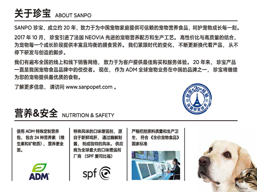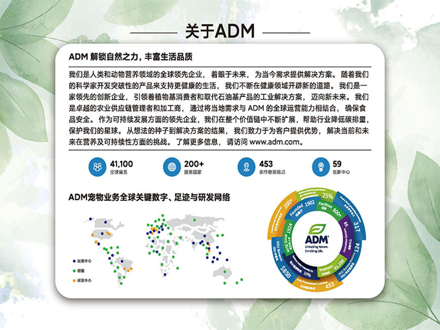 ADM作為人類、動物及寵物營養(yǎng)領(lǐng)域的全球前沿企業(yè),致力于寵物營養(yǎng)領(lǐng)域的創(chuàng)新,不斷開發(fā)出突破性的寵物產(chǎn)品,為中國的養(yǎng)寵家庭提供更加全面、精準的營養(yǎng)解決方案。