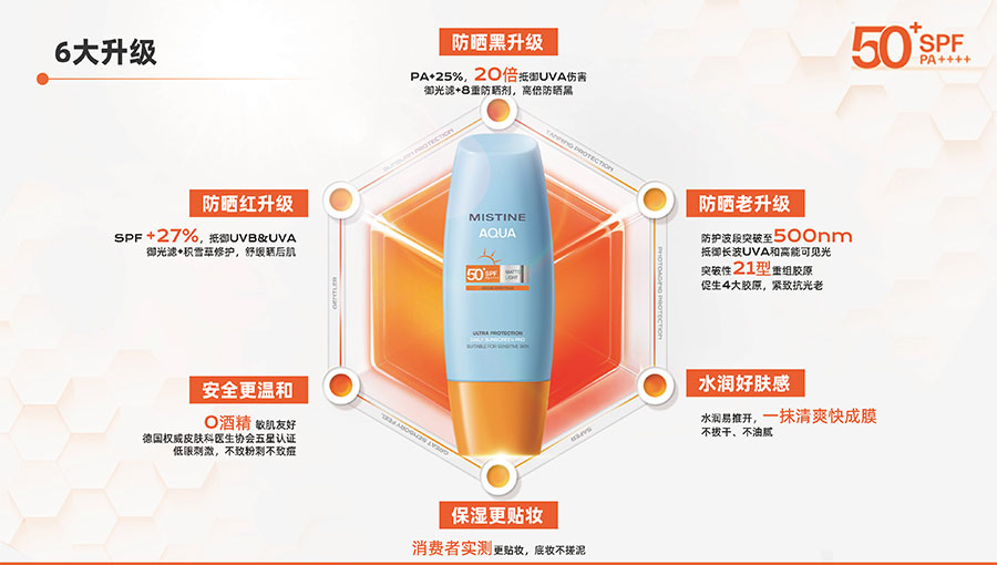 歷經(jīng)37年的科研沉淀,MISTINE蜜絲婷品牌在防曬、護膚、底妝、彩妝多個品類的產(chǎn)品開發(fā)中,堅持圍繞對“光”的研究,在光與防曬護膚、光與色彩妝容的產(chǎn)品應用層面,研究光、理解光、樂享光,持續(xù)不斷地提供產(chǎn)品解決方案,滿足消費者對防曬美白、潮流妝容、護膚健康的需求。防曬系列產(chǎn)品作為MISTINE蜜絲婷的知名品類,以物化生一體的全鏈路防曬技術,憑借高倍防曬、清爽膚感的高功效和高質(zhì)價比勝出,自2021年連續(xù)三年位于中國防曬護膚品銷量領先。