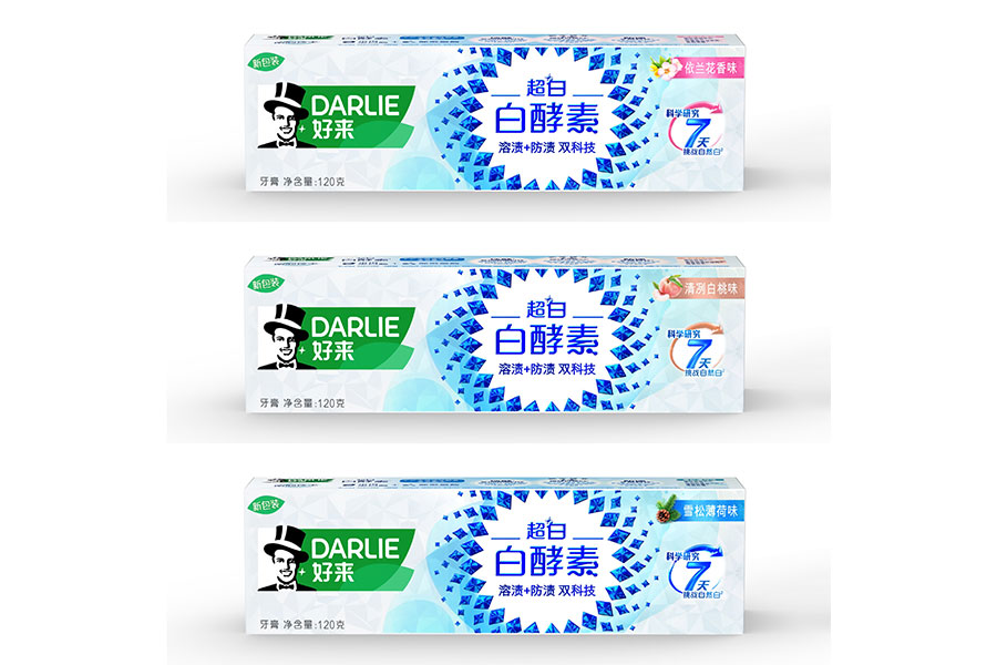 目前DARLIE好來牙膏共有數(shù)十個品種、多種規(guī)格(18g-250g),其中銷往中國大陸市場包括經(jīng)典的雙重薄荷系列、茶倍健系列、超白系列、專研護齦系列、抗敏感系列、透心爽系列,兒童牙膏系列及新增了白酵素系列和星耀白系列等20個品種,另外還有多個品種同時銷往新加坡、馬來西亞、泰國、中國香港和中國臺灣等市場。