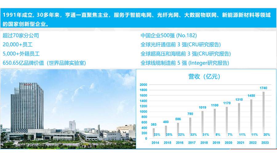 江蘇亨通電力電纜有限公司是亨通集團旗下的一家國家級重點高新技術(shù)企業(yè),注冊商標(biāo)“亨通光電”,注冊資金185168萬元,成立于1995年,目前員工總數(shù)為一千余人??梢匝邪l(fā)制造220kV及以下交聯(lián)電力電纜、防火電纜、光纖復(fù)合電纜、光伏電纜、鋁合金電纜、電氣裝備電纜、控制電纜、低壓電線等產(chǎn)品,可滿足電力、通信、交通、冶金、石油石化、煤炭、船舶、軍工等不同行業(yè)、地區(qū)和國家客戶的差異化需求。