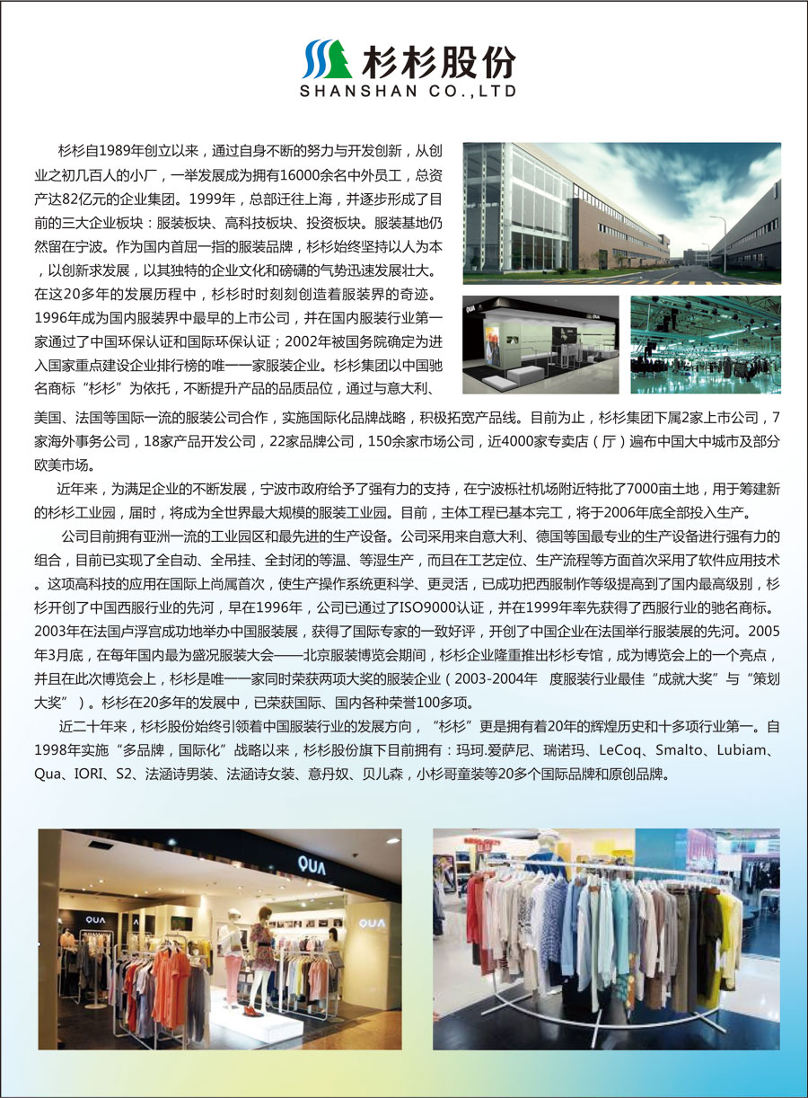 杉杉自1989年創(chuàng)立以來,通過自身不斷的努力與開發(fā)創(chuàng)新,從創(chuàng)業(yè)之初幾百人的小廠,一舉發(fā)展成為擁有16000余名中外員工,總資產(chǎn)達82億元的企業(yè)集團。1999年,總部遷往上海,并逐步形成了目前的三大企業(yè)板塊:服裝板塊、高科技板塊、投資板塊。服裝基地仍然留在寧波。作為國內首屈一指的服裝品牌,杉杉始終堅持以人為本,以創(chuàng)新求發(fā)展,以其獨特的企業(yè)文化和磅礴的氣勢迅速發(fā)展壯大。在這20多年的發(fā)展歷程中,杉杉時時刻刻創(chuàng)造著服裝界的奇跡。1996年成為國內服裝界中最早的上市公司,并在國內服裝行業(yè)第一家通過了中國環(huán)保認證和國際環(huán)保認證;2002年被國務院確定為進入國家重點建設企業(yè)排行榜的唯一一家服裝企業(yè)。杉杉集團以中國馳名商標“杉杉”為依托,不斷提升產(chǎn)品的品質品位,通過與意大利、美國、法國等國際一流的服裝公司合作,實施國際化品牌戰(zhàn)略,積極拓寬產(chǎn)品線。目前為止,杉杉集團下屬2家上市公司,7家海外事務公司,18家產(chǎn)品開發(fā)公司,22家品牌公司,150余家市場公司,近4000家專賣店(廳)遍布中國大中城市及部分歐美市場。