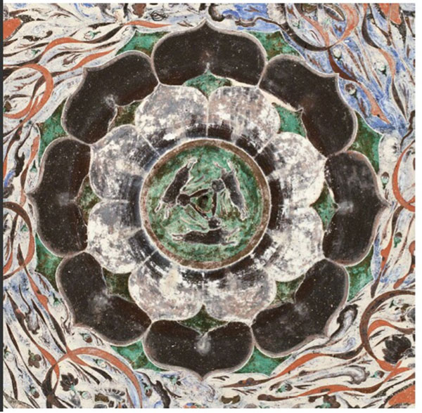 「三兔共耳」源于敦煌石窟第407窟頂中央藻井的“三兔聯(lián)跑蓮花紋”。在這個開鑿于隋代的洞窟中,窟頂中央繪制了數(shù)層八瓣大蓮花;周遭環(huán)繞著衣帶飄飄、手持花盤的飛天形象;蓮花中心則繪制了三只追逐奔跑的兔子。畫師以巧思將每只兔子二只耳朵中的一只重疊,看似三兔三耳,但以每只兔子各自的角度觀察,則雙耳俱全。三只兔耳組成等邊三角形,配合外圍的蓮瓣與飛天,不僅兔子奔跑跳躍的神態(tài)生動逼真,整個藻井紋飾也都充滿了動感!