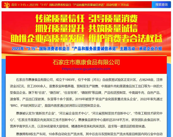 傳遞質(zhì)量信任,引導(dǎo)質(zhì)量消費(fèi),近日,由中國(guó)質(zhì)量檢驗(yàn)協(xié)會(huì)主辦的2023年3·15國(guó)際消費(fèi)者權(quán)益日“產(chǎn)品和服務(wù)質(zhì)量誠(chéng)信承諾”主題活動(dòng)順利召開(kāi)。在本次活動(dòng)中,石家莊市惠康食品有限公司憑借優(yōu)質(zhì)的產(chǎn)品質(zhì)量及誠(chéng)信經(jīng)營(yíng)榮膺“全國(guó)產(chǎn)品和服務(wù)質(zhì)量誠(chéng)信示范企業(yè)”,““全國(guó)預(yù)制菜行業(yè)質(zhì)量領(lǐng)先企業(yè) ”,公司旗下谷言預(yù)制菜系列產(chǎn)品榮獲“全國(guó)消費(fèi)者質(zhì)量信譽(yù)保障產(chǎn)品”榮譽(yù)。為營(yíng)造公平、公正、誠(chéng)信經(jīng)營(yíng)的市場(chǎng)環(huán)境,樹(shù)立質(zhì)量標(biāo)桿、弘揚(yáng)質(zhì)量先進(jìn)做出了表率作用。
