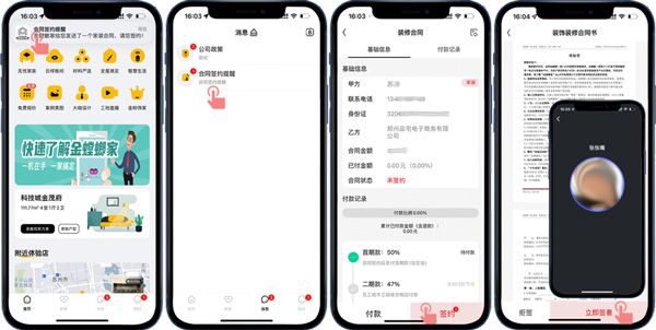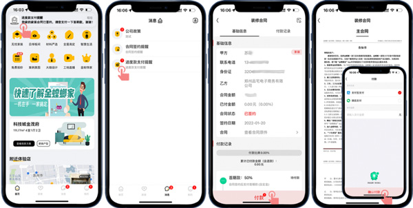 客戶線上確定好裝修門店后,門店會(huì)擬好線上合同,并推送到客戶的APP賬號(hào),客戶收到合同簽約提醒就可以在線簽約操作了,合同簽好后通過進(jìn)度款支付提醒可以進(jìn)行在線付款操作。