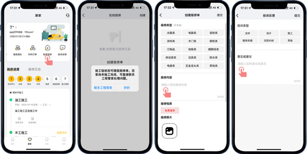 裝修完工后,客戶通過“新家-無憂家裝險(xiǎn)卡片”查看本次裝修,門店為其購買的保險(xiǎn),家裝險(xiǎn)主要保障:房屋主體、房屋附屬設(shè)施、室內(nèi)裝潢、室內(nèi)財(cái)產(chǎn)等。裝修過程中,客戶有需要報(bào)修可直接聯(lián)系工程管家,若遇到無法協(xié)調(diào)的問題,客戶可選擇在線進(jìn)行投訴反饋。裝修完工后,客戶有需要報(bào)修可在線創(chuàng)建報(bào)修單,為你新家的未來增添一份保障。