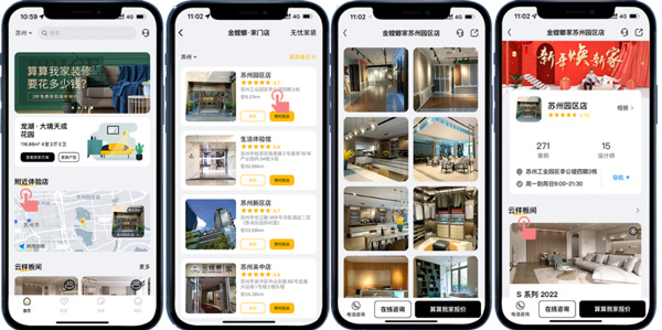 目前,金螳螂家在全國擁有150家門店,客戶可以通過“附近體驗(yàn)店”選擇客戶所在城市的服務(wù)門店,在這里可以了解到該門店的720度VR全景樣板間、案例、設(shè)計(jì)師以及客戶的真實(shí)評(píng)價(jià),不用出門探訪實(shí)體門店,就能快速了解門店情況,省時(shí)又省力!