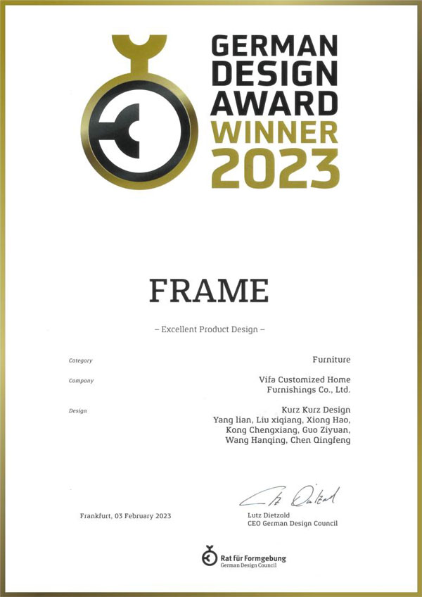 近日,由德國設計委員會主辦的German Design Awards 德國國家設計獎公布了2023年度獲獎名單,高端家居定制品牌vifa威法的作品FRAME(Alita智能廚廳)榮獲卓越產(chǎn)品設計大獎(Excellent Product Design),這也是世界上最具價值的設計獎項之一,代表著威法的設計能力得到世界設計領域的高度贊譽,凸顯威法對高端生活美學的卓越引領能力。