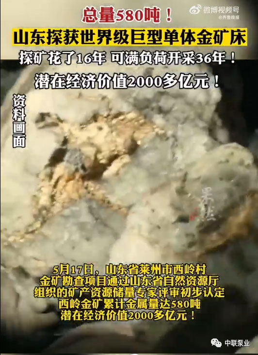 山東萊州市西嶺村金礦勘查項(xiàng)目通過省自然資源廳組織的儲(chǔ)量專家評審,初步認(rèn)定西嶺金礦新增金金屬量近200噸,累計(jì)金金屬量達(dá)580噸,潛在經(jīng)濟(jì)價(jià)值2000多億元,是迄今為止國內(nèi)發(fā)現(xiàn)的最大單體金礦床。