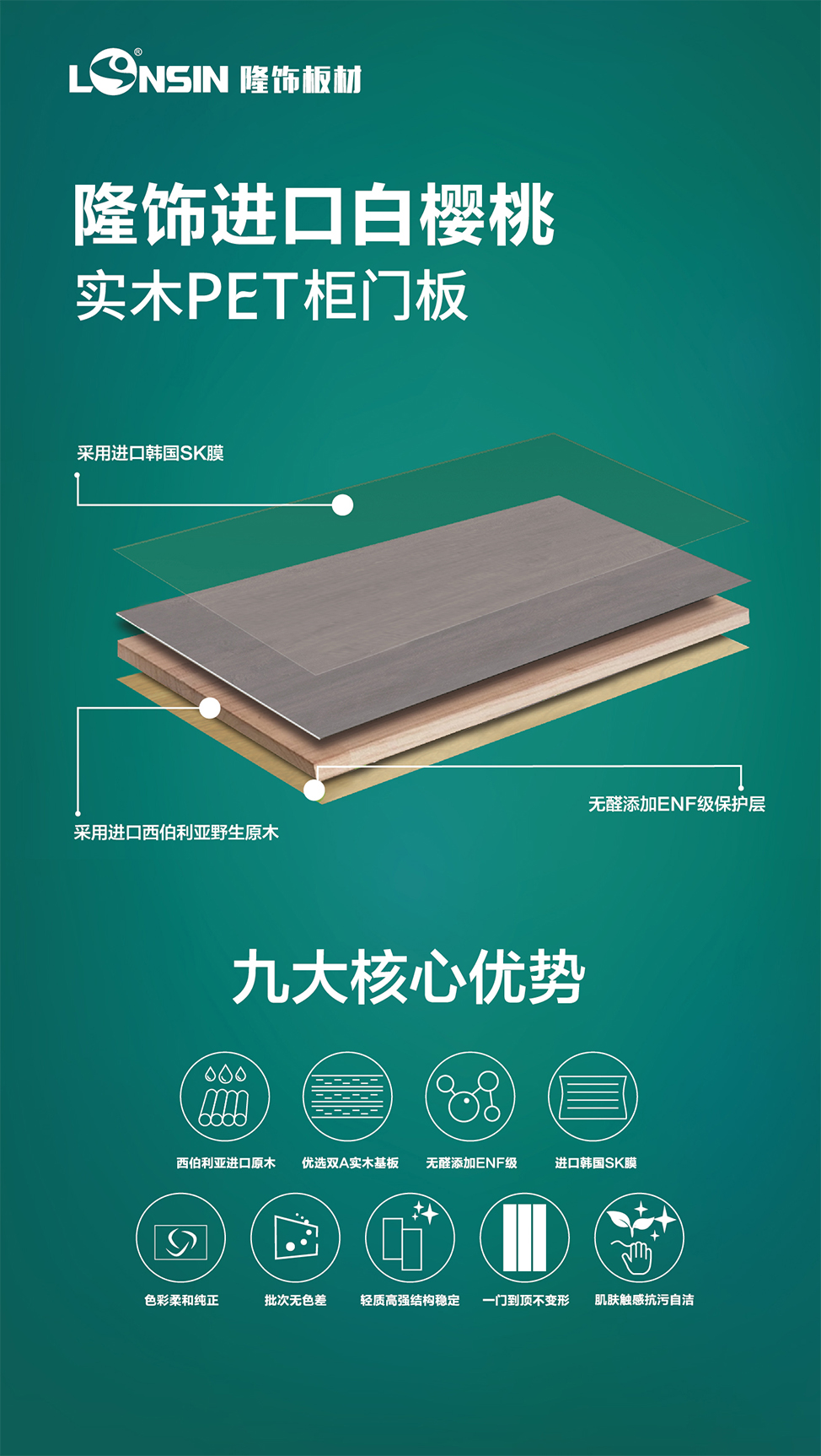 “提升高品質(zhì)服務(wù)、推動(dòng)綠色家居產(chǎn)業(yè)發(fā)展”是隆飾板材一直以來(lái)的發(fā)展使命,多年來(lái),隆飾從未停止研發(fā)創(chuàng)新的步伐,不斷與時(shí)俱進(jìn),將“工匠精神”融入每一個(gè)環(huán)節(jié)中,打造更具競(jìng)爭(zhēng)力的優(yōu)勢(shì)產(chǎn)品和服務(wù)。不僅有一直引以為傲的ENF級(jí)生態(tài)板和市場(chǎng)大熱的家具板,隆飾還將重磅推出全新高端產(chǎn)品——“ENF級(jí)進(jìn)口白櫻桃高端實(shí)木精板”,滿(mǎn)足了消費(fèi)者對(duì)環(huán)保和品質(zhì)愈發(fā)強(qiáng)烈的追求。