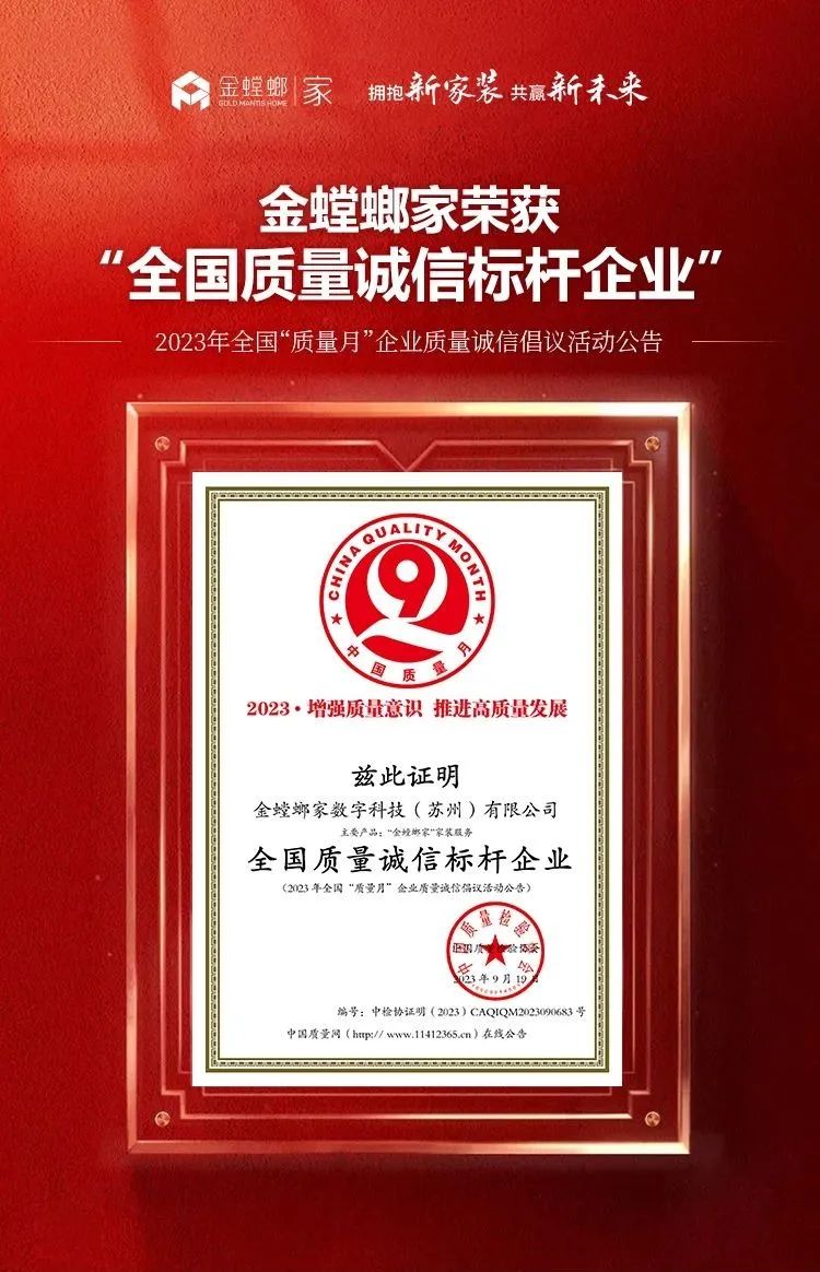 共筑質(zhì)量誠信!金螳螂家再次榮獲「全國質(zhì)量誠信標(biāo)桿企業(yè)」榮譽(yù)稱號(hào)