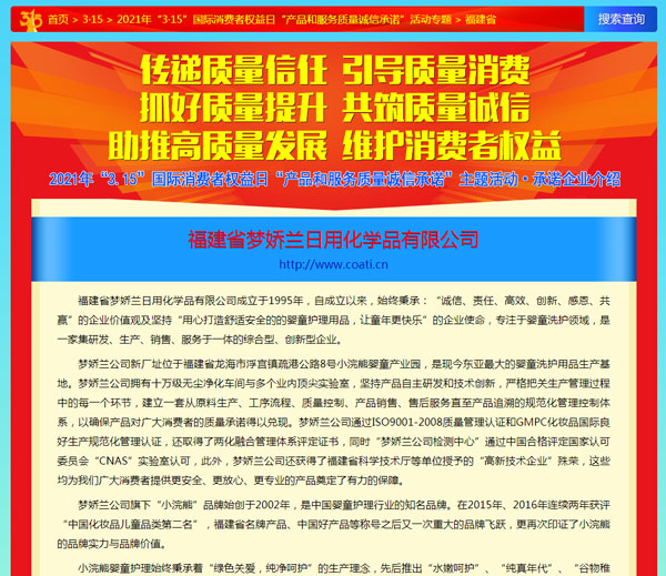 引導(dǎo)質(zhì)量消費(fèi),共筑質(zhì)量誠(chéng)信,3月15日,由中國(guó)質(zhì)量檢驗(yàn)協(xié)會(huì)主辦的2021年“3.15”產(chǎn)品和服務(wù)質(zhì)量誠(chéng)信承諾的主題活動(dòng)如期舉行,小浣熊作為“3.15”產(chǎn)品和服務(wù)質(zhì)量誠(chéng)信承諾企業(yè),憑借匠心的品質(zhì)、優(yōu)質(zhì)的服務(wù)及良好的口碑,獲得協(xié)會(huì)以及權(quán)威專(zhuān)家的一致認(rèn)可,榮獲“全國(guó)產(chǎn)品和服務(wù)質(zhì)量誠(chéng)信示范企業(yè)”,“全國(guó)質(zhì)量誠(chéng)信先進(jìn)企業(yè)”、“全國(guó)質(zhì)量信譽(yù)保障產(chǎn)品”、“全國(guó)日化行業(yè)質(zhì)量領(lǐng)先品牌” 等多項(xiàng)榮譽(yù),《中國(guó)質(zhì)量報(bào)》、《中國(guó)消費(fèi)者報(bào)》及中國(guó)質(zhì)量網(wǎng)、中國(guó)經(jīng)濟(jì)網(wǎng)、中國(guó)消費(fèi)網(wǎng)等多家媒體均予以集中展示和公告。