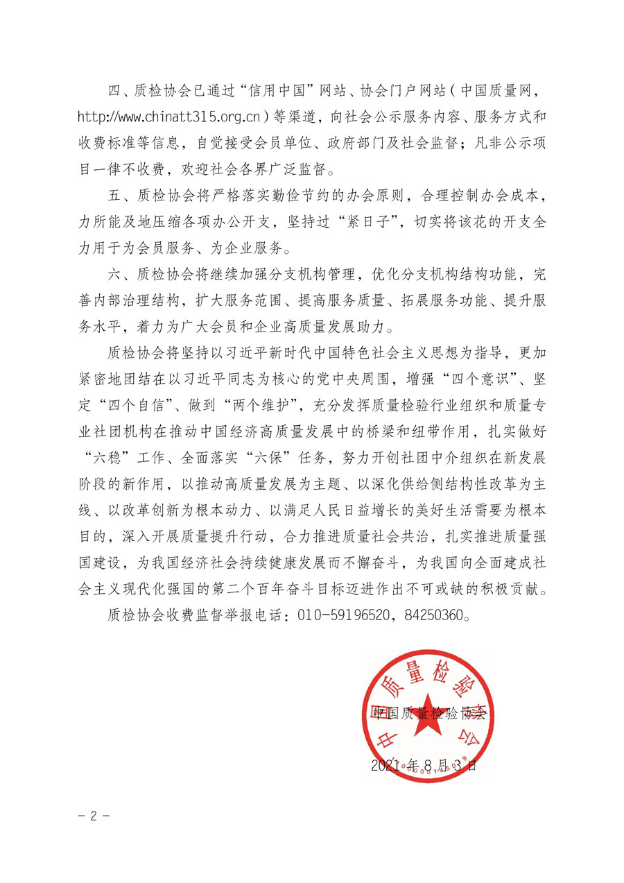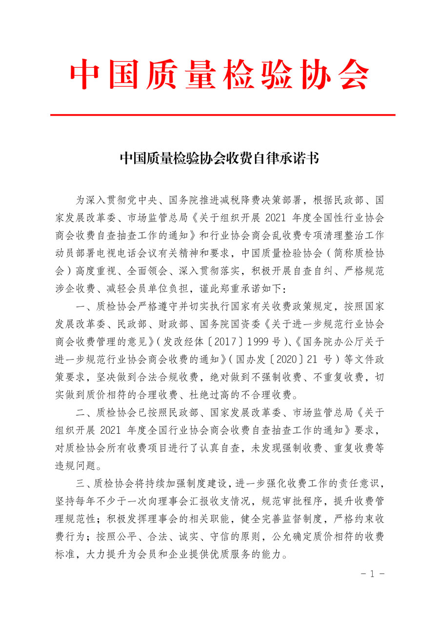 中國(guó)質(zhì)量檢驗(yàn)協(xié)會(huì)收費(fèi)自律承諾書