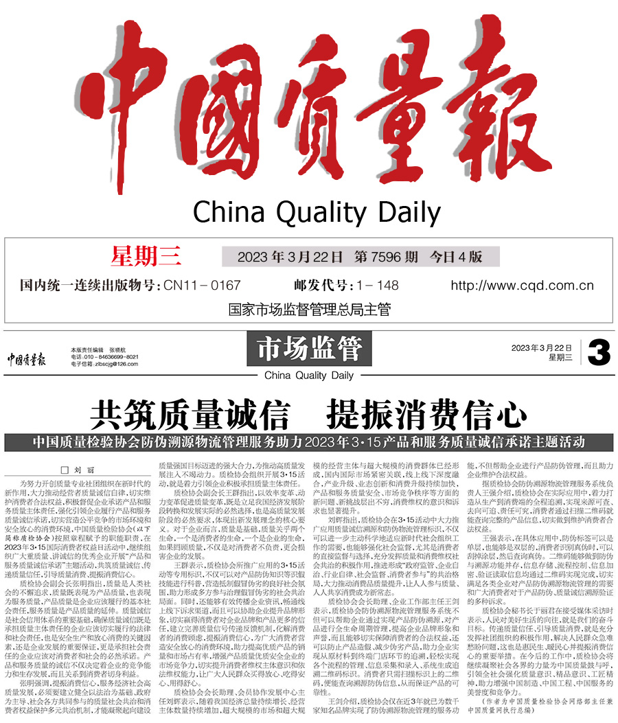 中國(guó)質(zhì)量報(bào):共筑質(zhì)量誠(chéng)信 提振消費(fèi)信心——中國(guó)質(zhì)量檢驗(yàn)協(xié)會(huì)防偽溯源物流管理服務(wù)助力2023年3·15產(chǎn)品和服務(wù)質(zhì)量誠(chéng)信承諾主題活動(dòng)