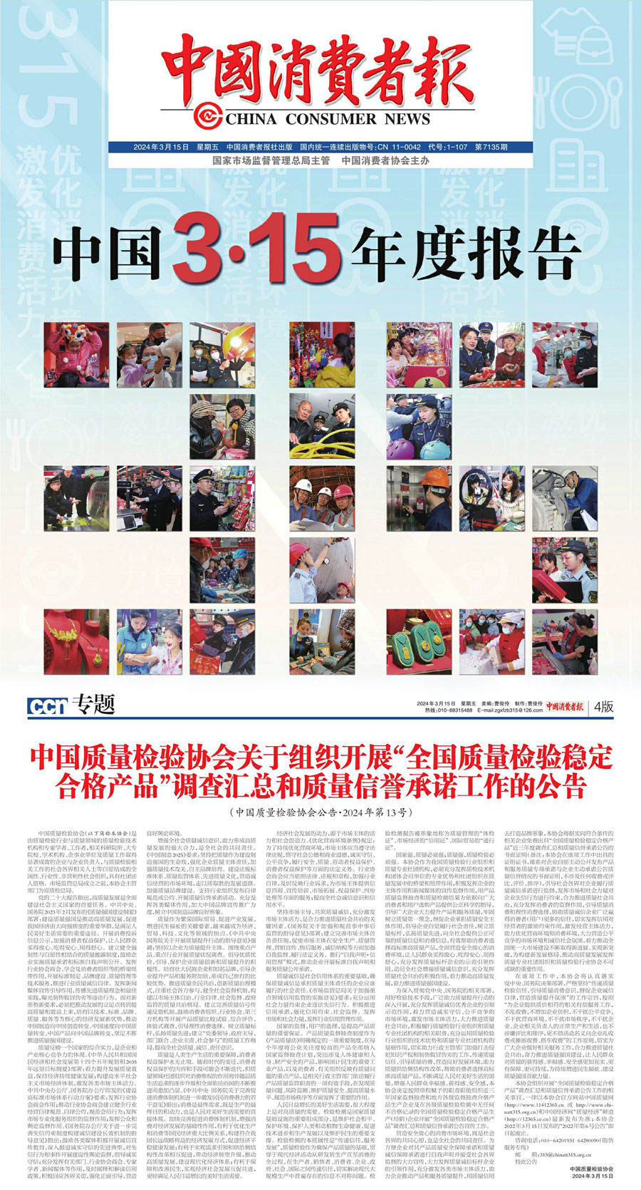 中國(guó)消費(fèi)者報(bào):中國(guó)質(zhì)量檢驗(yàn)協(xié)會(huì)關(guān)于組織開展2024年“3·15”產(chǎn)品和服務(wù)質(zhì)量誠(chéng)信承諾主題活動(dòng)的公告