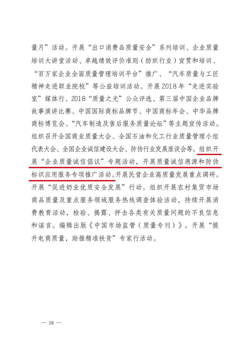 2018年8月16日,國(guó)家市場(chǎng)監(jiān)督管理總局、中共中央宣傳部、國(guó)家發(fā)展和改革委員會(huì)、教育部、科學(xué)技術(shù)部、工業(yè)和信息化部、公安部、人力資源和社會(huì)保障部等2018年全國(guó)“質(zhì)量月”活動(dòng)主辦單位聯(lián)合印發(fā)《市場(chǎng)監(jiān)管總局等關(guān)于開(kāi)展2018年全國(guó)“質(zhì)量月”活動(dòng)的通知》(國(guó)市監(jiān)質(zhì)〔2018〕131號(hào)),并在《2018年全國(guó)“質(zhì)量月”主辦單位開(kāi)展的主要活動(dòng)》中明確部署中國(guó)質(zhì)量檢驗(yàn)協(xié)會(huì):組織開(kāi)展“企業(yè)質(zhì)量誠(chéng)信倡議”專(zhuān)題活動(dòng),開(kāi)展質(zhì)量誠(chéng)信溯源和防偽標(biāo)識(shí)應(yīng)用服務(wù)專(zhuān)項(xiàng)推廣活動(dòng)。