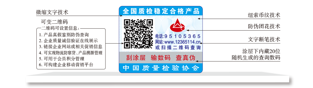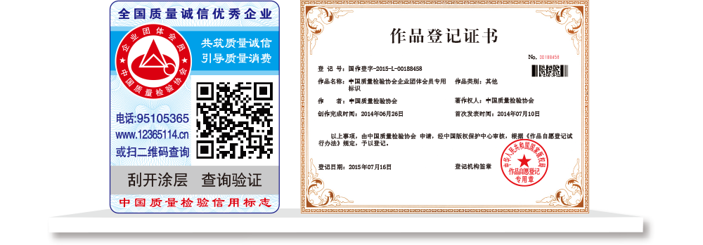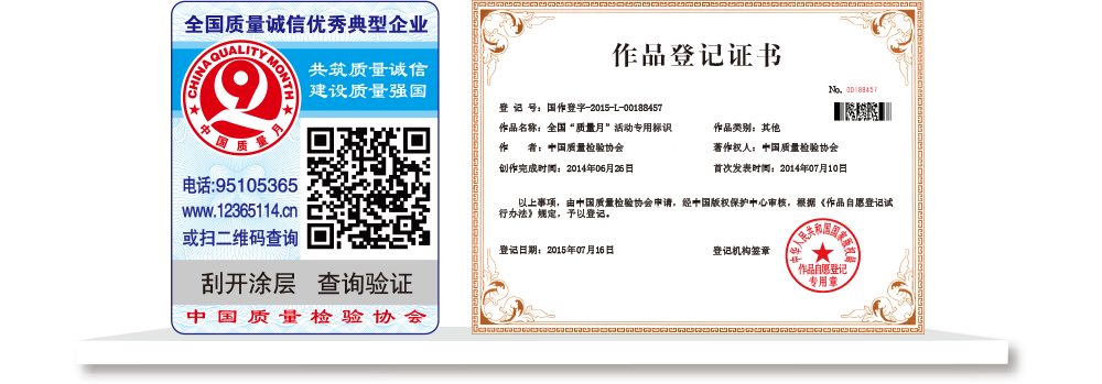 【“全國(guó)質(zhì)檢穩(wěn)定合格產(chǎn)品”專(zhuān)用標(biāo)識(shí)】具有專(zhuān)屬的知識(shí)產(chǎn)權(quán)(經(jīng)中國(guó)版權(quán)保護(hù)中心審核,國(guó)家版權(quán)局對(duì)“全國(guó)質(zhì)檢穩(wěn)定合格產(chǎn)品”專(zhuān)用標(biāo)識(shí)頒發(fā)了《作品登記證書(shū)》,登記號(hào):國(guó)作登字-2015-L-00188456),基本規(guī)格為5cm2,集電話(huà)電碼防偽查詢(xún)、二維碼在線(xiàn)掃描、微信驗(yàn)證等多種功能于一體,綜合運(yùn)用了紐索幣紋、微縮文字、熒光激發(fā)油墨等多種防偽技術(shù);專(zhuān)用標(biāo)識(shí)加貼在產(chǎn)品或包裝上,消費(fèi)者只需要用座機(jī)(手機(jī))電話(huà)撥打全國(guó)范圍內(nèi)都不需要加區(qū)號(hào)的特服號(hào)碼95105365或使用手機(jī)掃描二維碼或登陸網(wǎng)站(http://www.12365114.cn)就可直接查詢(xún)驗(yàn)證加貼專(zhuān)用標(biāo)識(shí)的產(chǎn)品為中國(guó)質(zhì)量檢驗(yàn)協(xié)會(huì)調(diào)查匯總證明的全國(guó)質(zhì)量檢驗(yàn)穩(wěn)定合格產(chǎn)品,助力企業(yè)通過(guò)“質(zhì)量檢驗(yàn)”的比較優(yōu)勢(shì)去贏得消費(fèi)者更多的信任,形成企業(yè)自己獨(dú)有的比較優(yōu)勢(shì)。