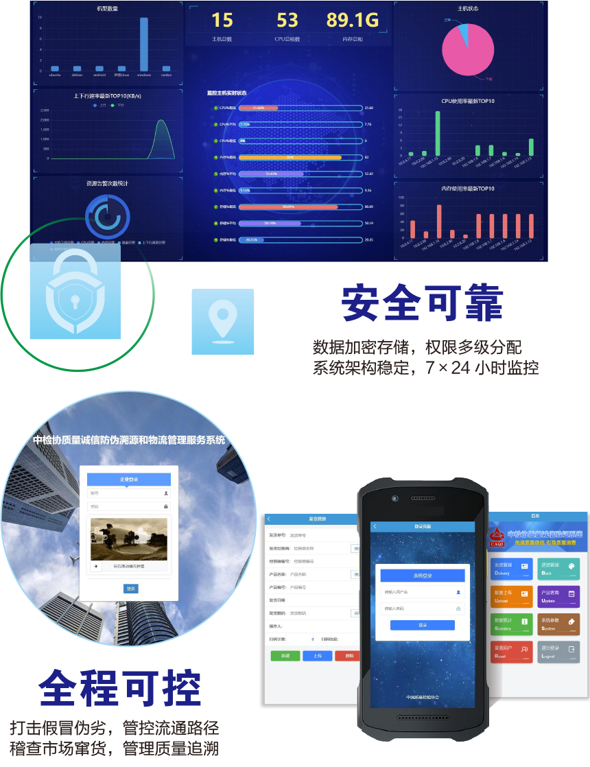 中國(guó)質(zhì)量檢驗(yàn)協(xié)會(huì)防偽溯源和物流管理服務(wù)系統(tǒng)(簡(jiǎn)稱(chēng)中檢聯(lián)合質(zhì)量誠(chéng)信驗(yàn)證系統(tǒng))是以物聯(lián)網(wǎng)、大數(shù)據(jù)、云計(jì)算、區(qū)塊鏈和移動(dòng)互聯(lián)網(wǎng)技術(shù)為基礎(chǔ)建設(shè)的全過(guò)程防偽溯源與質(zhì)量誠(chéng)信驗(yàn)證服務(wù)平臺(tái),依托廣大技術(shù)機(jī)構(gòu)的技術(shù)支撐,應(yīng)用二維碼為載體,使用一物一碼防偽技術(shù),同時(shí)采用文字、圖片和視頻等多媒體方式,完整記錄產(chǎn)品的原料來(lái)源、生產(chǎn)加工、倉(cāng)儲(chǔ)物流和市場(chǎng)銷(xiāo)售等詳細(xì)信息,融合實(shí)現(xiàn)產(chǎn)品質(zhì)量來(lái)源可查、去向可追、責(zé)任可究的全過(guò)程追溯,切實(shí)方便企業(yè)履行質(zhì)量安全主體責(zé)任并用科技、智能化、信息化的手段去加強(qiáng)質(zhì)量安全風(fēng)險(xiǎn)控制,維護(hù)消費(fèi)者合法權(quán)益,讓人民群眾買(mǎi)得放心、吃得放心、用得放心。