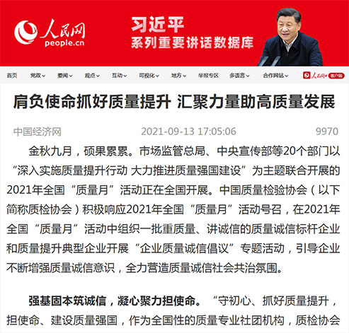 中國經(jīng)濟網(wǎng):肩負(fù)使命抓好質(zhì)量提升 匯聚力量助高質(zhì)量發(fā)展——中國質(zhì)量檢驗協(xié)會組織開展2021年全國“質(zhì)量月”企業(yè)質(zhì)量誠信倡議專題活動