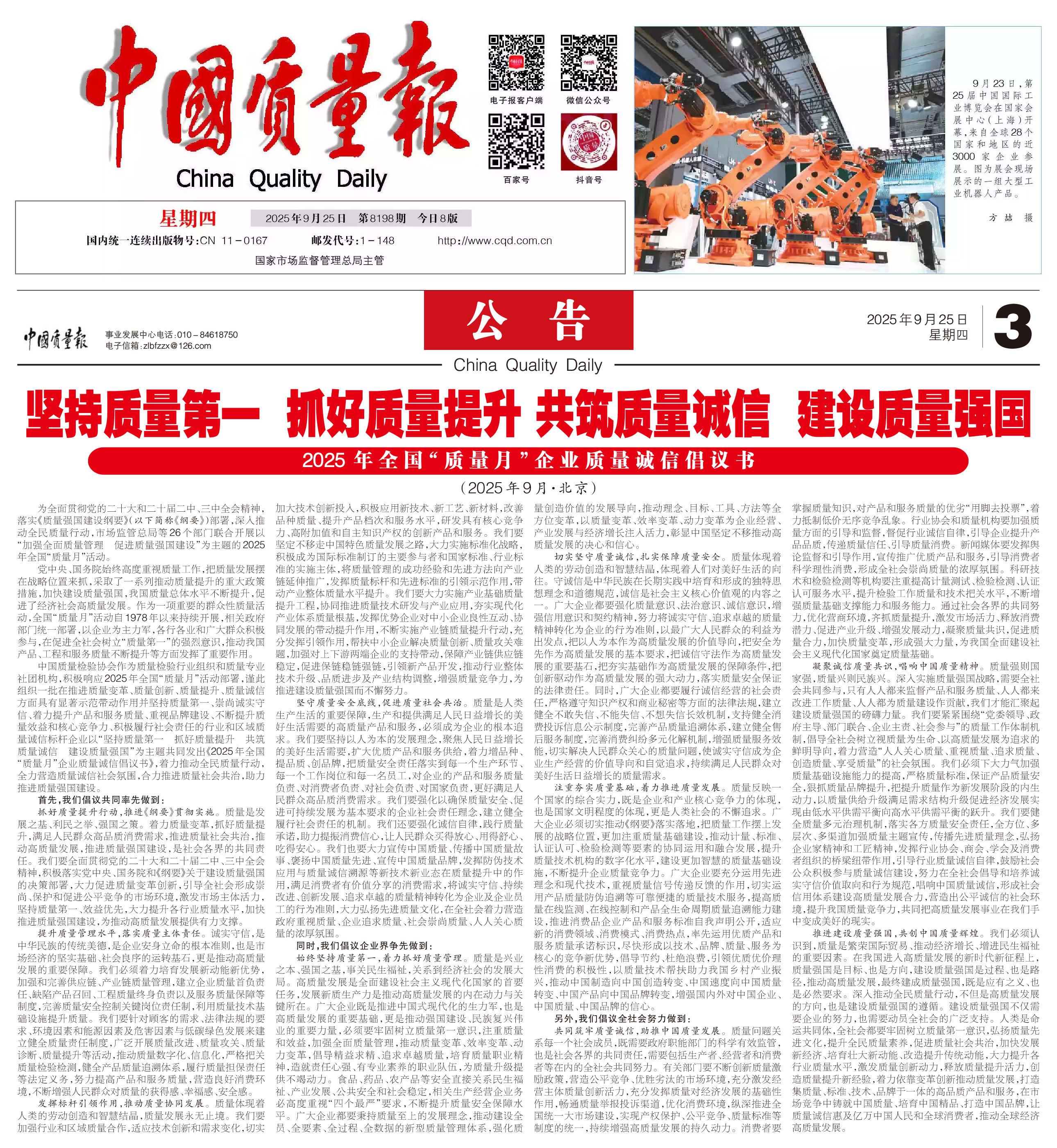 - 《中國質(zhì)量報》(2025年9月25日刊)發(fā)布:堅持質(zhì)量第一 抓好質(zhì)量提升 共筑質(zhì)量誠信 建設質(zhì)量強國——2025年全國“質(zhì)量月”企業(yè)質(zhì)量誠信倡議書(2025年9月·北京)