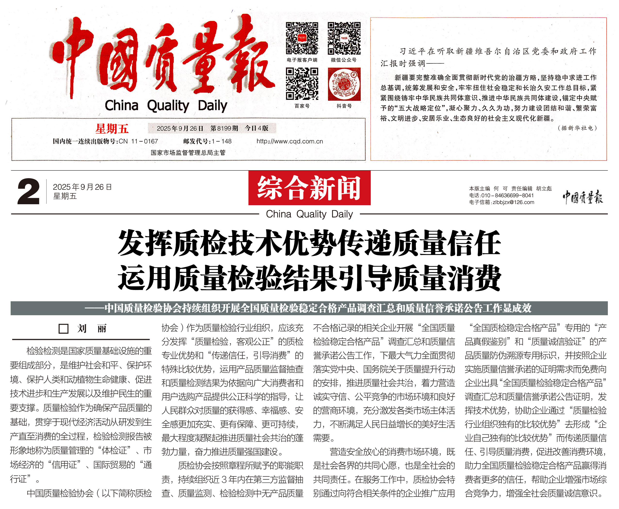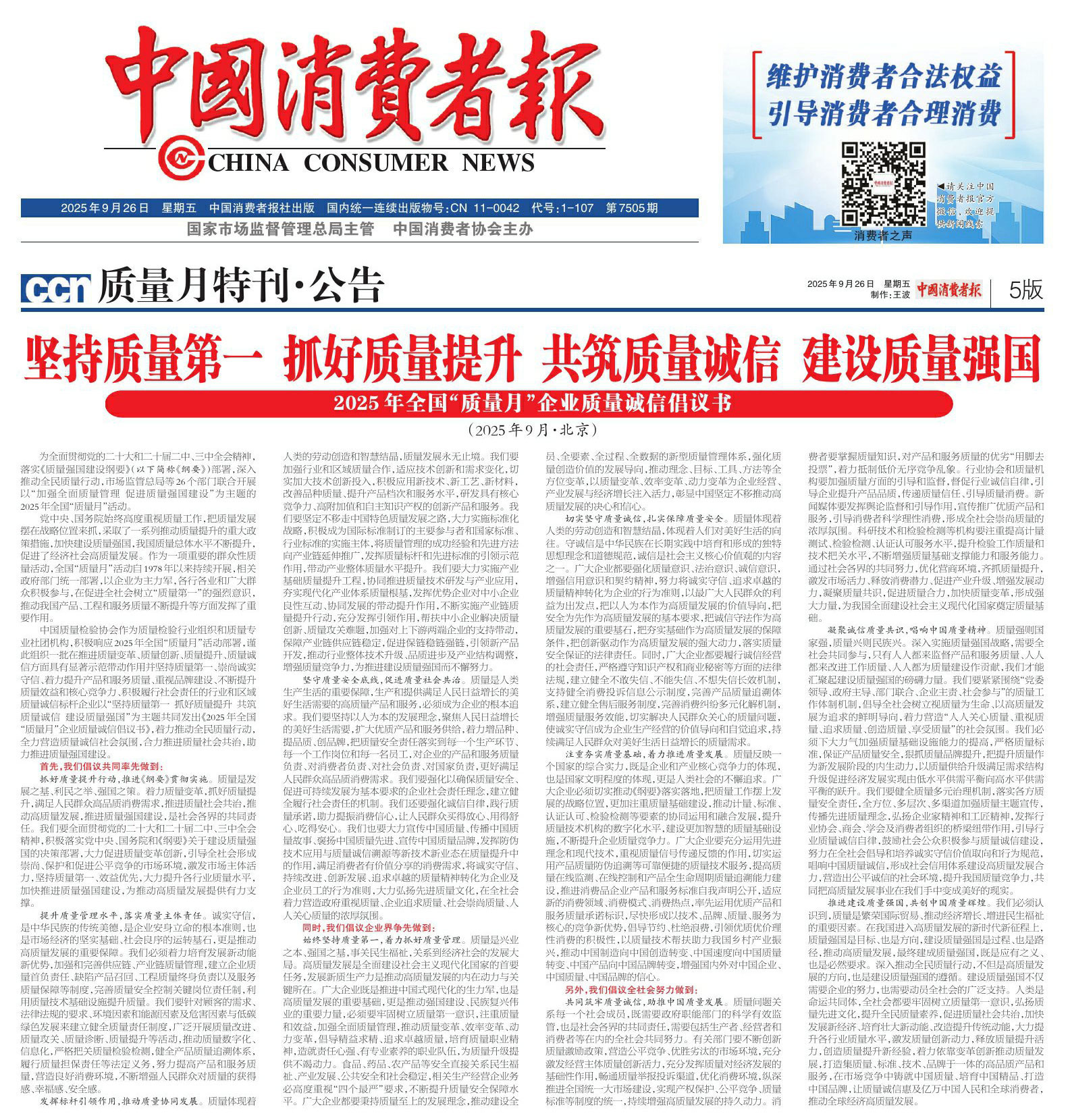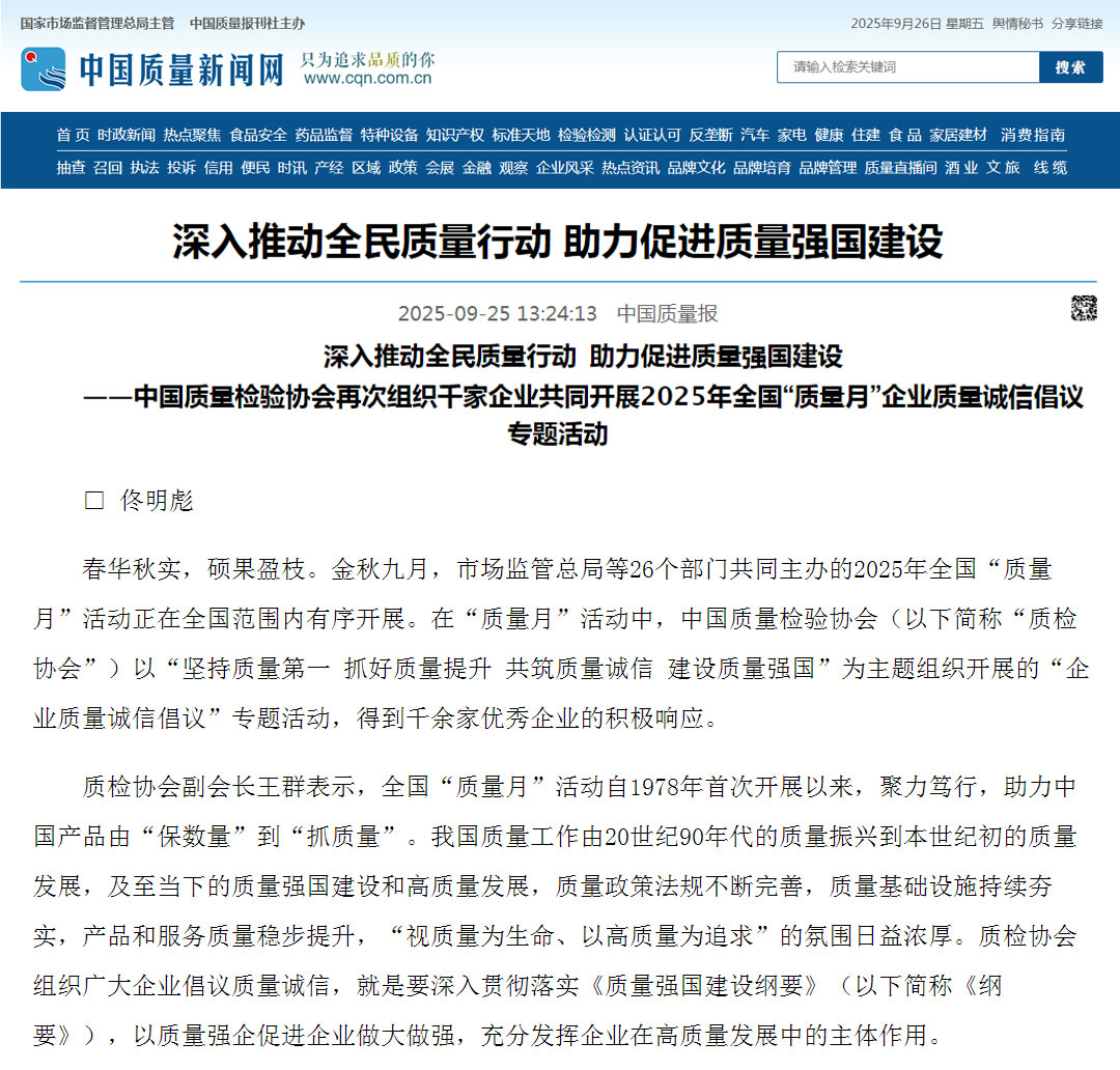 - 《中國質(zhì)量報》(2025年9月26日刊)發(fā)布:堅持質(zhì)量第一 抓好質(zhì)量提升 共筑質(zhì)量誠信 建設質(zhì)量強國——2025年全國“質(zhì)量月”企業(yè)質(zhì)量誠信倡議書(2025年9月·北京)