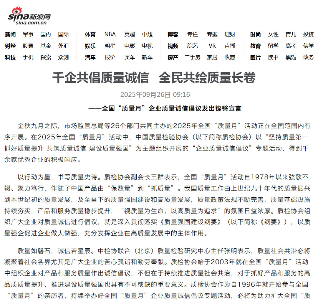 - 新浪網(wǎng)報道——千家企業(yè)發(fā)出倡議:視質(zhì)量為生命 以高質(zhì)量為追求——中國質(zhì)量檢驗協(xié)會組織開展2025年全國“質(zhì)量月”企業(yè)質(zhì)量誠信倡議活動