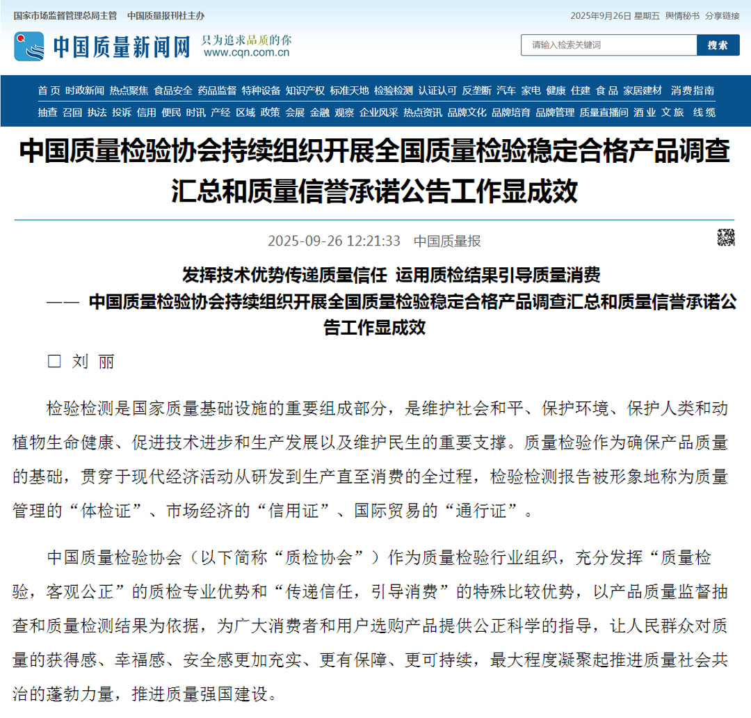 - 《中國質(zhì)量報》(2025年9月26日刊)發(fā)布:發(fā)揮技術優(yōu)勢傳遞質(zhì)量信任 運用質(zhì)檢結(jié)果引導質(zhì)量消費————中國質(zhì)量檢驗協(xié)會持續(xù)組織開展全國質(zhì)量檢驗穩(wěn)定合格產(chǎn)品調(diào)查匯總和質(zhì)量信譽承諾公告工作顯成效